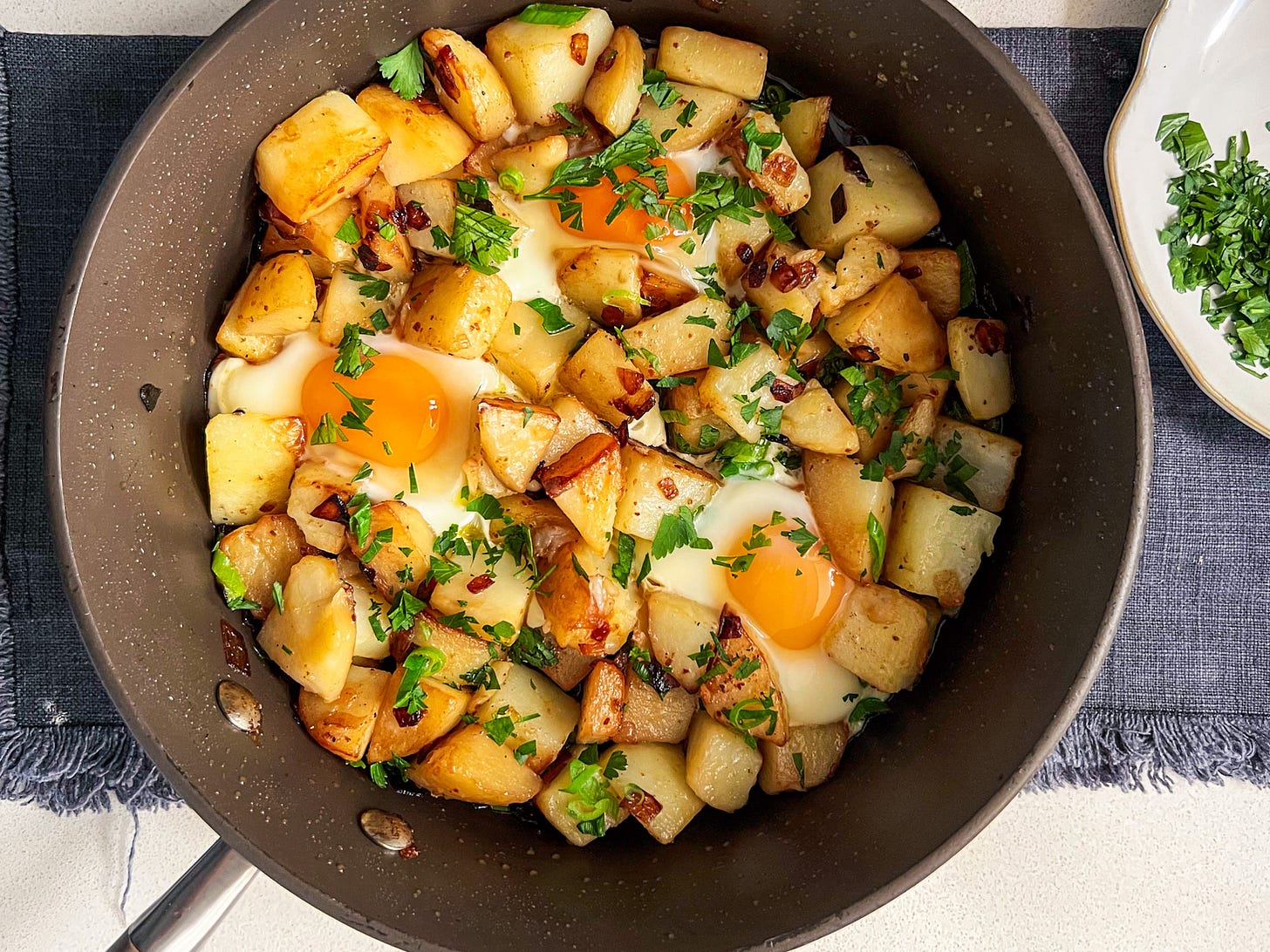 This traditional Batta wa Bayth is the perfect example. It’s simple, quick and requires a couple of pantry/fridge staples. Growing up, this was one of those meals we made when there was “nothing to eat.” Somehow, a few potatoes, eggs and pantry spices always came together to make something satisfying and comforting. It’s simple, familiar and always hits the spot.