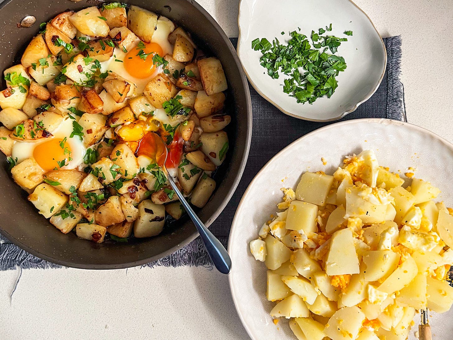 The other method is my own ‘fancier’ version of the traditional and the way I personally love it. It involves caramelising onions and pan-frying potatoes, then adding eggs to your preferred level of doneness (I prefer a runny yolk!).